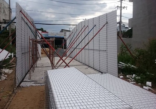 Dựng dầm bê tông dự ứng lực lên 2 bên xây tường bằng vật liệu nhẹ (kích thước dầm được tính toán trước theo thiết kế)